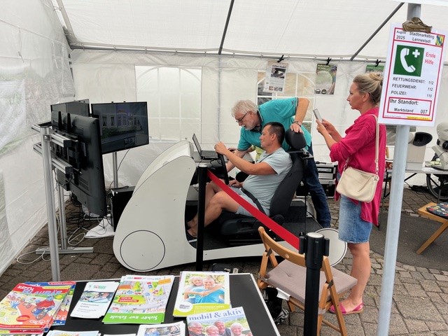 Das Gerät trug mit dazu bei, dass etliche Besucherinnen und Besucher des Stadtfestes innehielten, um ihre Fahrsicherheit bei unterschiedlichen Anforderungen zu erproben und zu testen. Den Hinweisen der Moderatoren gegenüber waren sie aufgeschlossen und in der Regel auch zu einem Seh- und Reaktionstest bereit. Das gab Gelegenheit, über subjektive Erfahrungen im Straßenverkehr zu diskutieren und Ratschläge für eine effektive Unfallverhütung für alle Arten der Teilnahme am Straßenverkehr zu geben. Ergänzt wurden die Hinweise durch die Aushändigung aktueller Informationsschriften des DVR und der DVW.