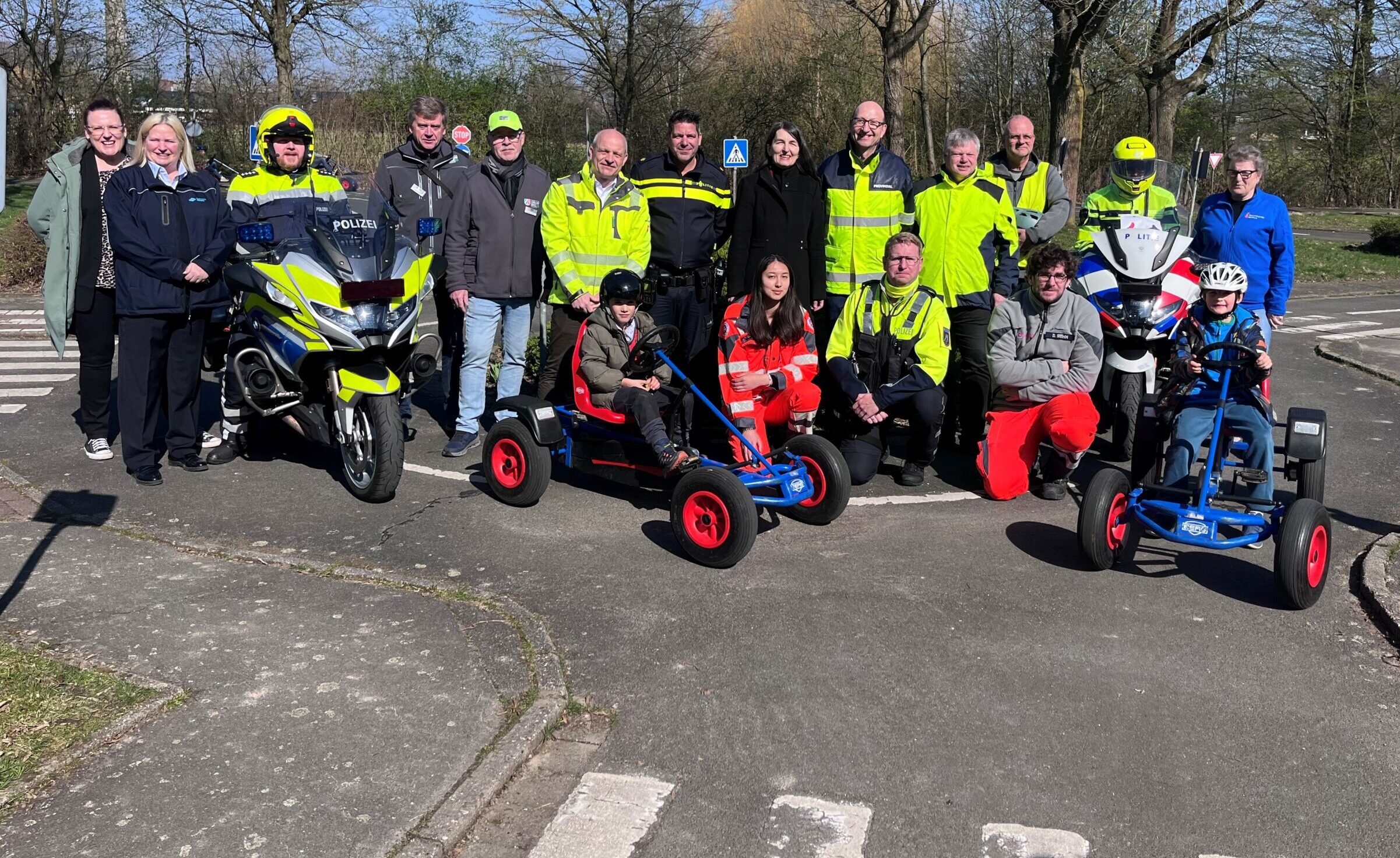 Es fand ein Fototermin in der Jugendverkehrsschule statt, an dem Vertreter sämtlicher an dem Tag beteiligter Organisationen teilnahmen. Hierzu zählten unter anderem die Polizei Münster, die niederländische Polizei, die Stadt Münster, die Provinzial Versicherung, die Kinderneurologiehilfe Münster e. V., DEKRA, der VVWL (Landesverband Transportlogistik und Entsorgung), die Stadtwerke Münster sowie die Johanniter-Unfall-Hilfe. Foto: VW Münster